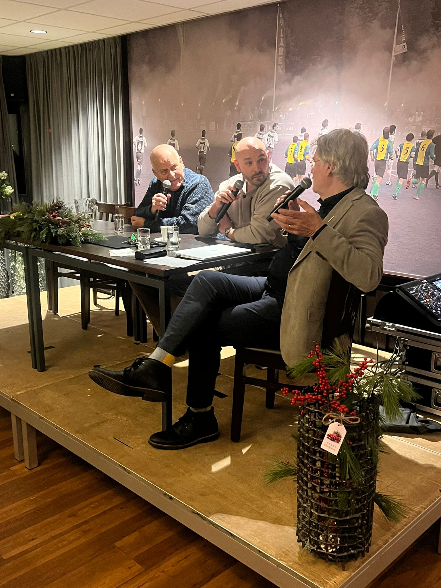 Na de koffie nam Gijs Eijsink het stokje over en ging hij in gesprek met de bekende sportverslaggever Evert ten Napel en onze eigen WVV’34 1-trainer en oud-profvoetballer Leon van Dijk. Al snel vlogen de anekdotes over tafel en wisten vooral de voetbalvisie en de vele verhalen van Evert ten Napel iedereen te boeien.