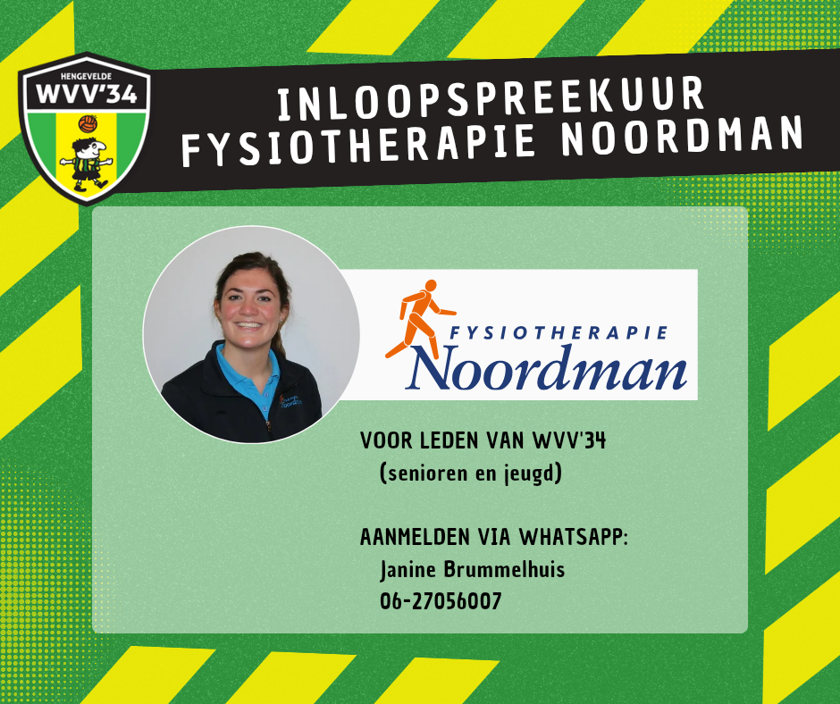 Fysiotherapie Noordman, gevestigd op ons sportpark, biedt wekelijks een inloopspreekuur aan. Dit spreekuur is speciaal bedoeld voor korte consulten en het stellen van diagnoses bij blessures. Het is een extra service die wij vanuit de vereniging, in samenwerking met Fysiotherapie Noordman, aanbieden aan alle leden van WVV'34.