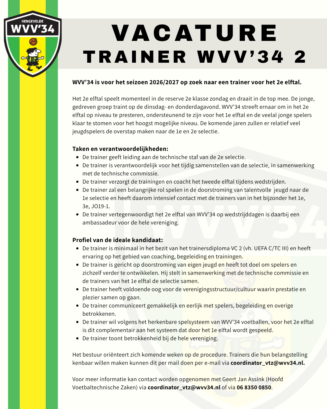 Voor seizoen 2026/2027 is WVV’34 op zoek naar een gedreven trainer die wil bouwen aan een jonge, talentvolle selectie in de reserve 2e klasse. Ben jij iemand die ontwikkeling, doorstroming van jeugd en prestatie weet te combineren én graag samenwerkt binnen een hechte clubcultuur? Dan komen we graag met je in contact.
